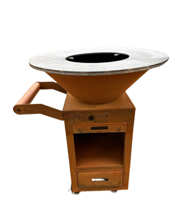 Diameter: 1000 mm * hoogte: 1000 mmDikte ring: 10 mmGewicht: 125–135 kgInclusief wielenMet eikenhouten handvat
